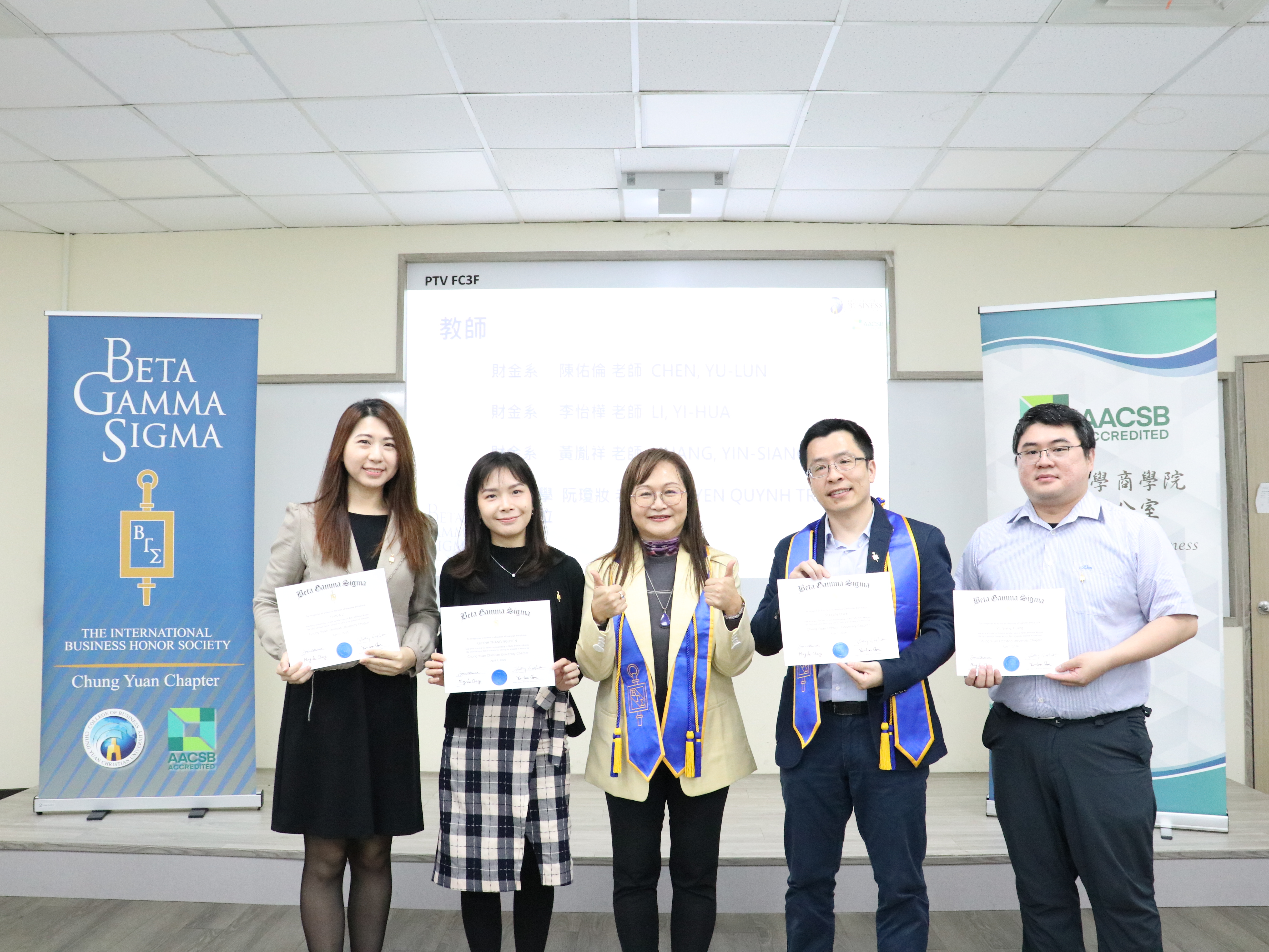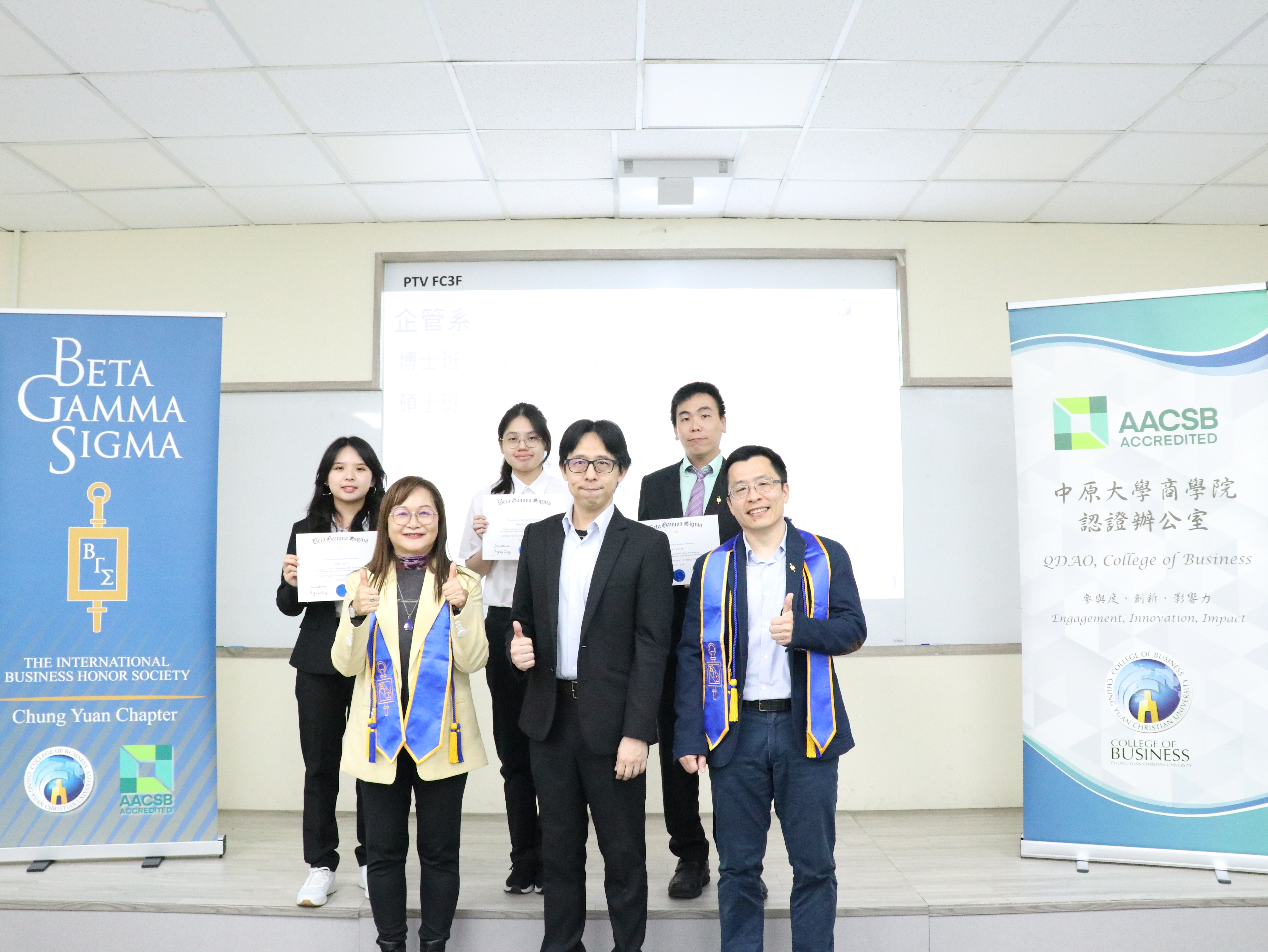 A highlight of the ceremony was the presentation of a US$1,000 scholarship awarded by Beta Gamma Sigma (BGS) Headquarters to recognize outstanding business talent. The recipients were You-Fu Huang (Ph.D. Program in Business), Yu-Chi Lin (Master’s Program, Department of Accounting), and Si-Luo Wu (Bachelor’s Program, Department of Accounting).