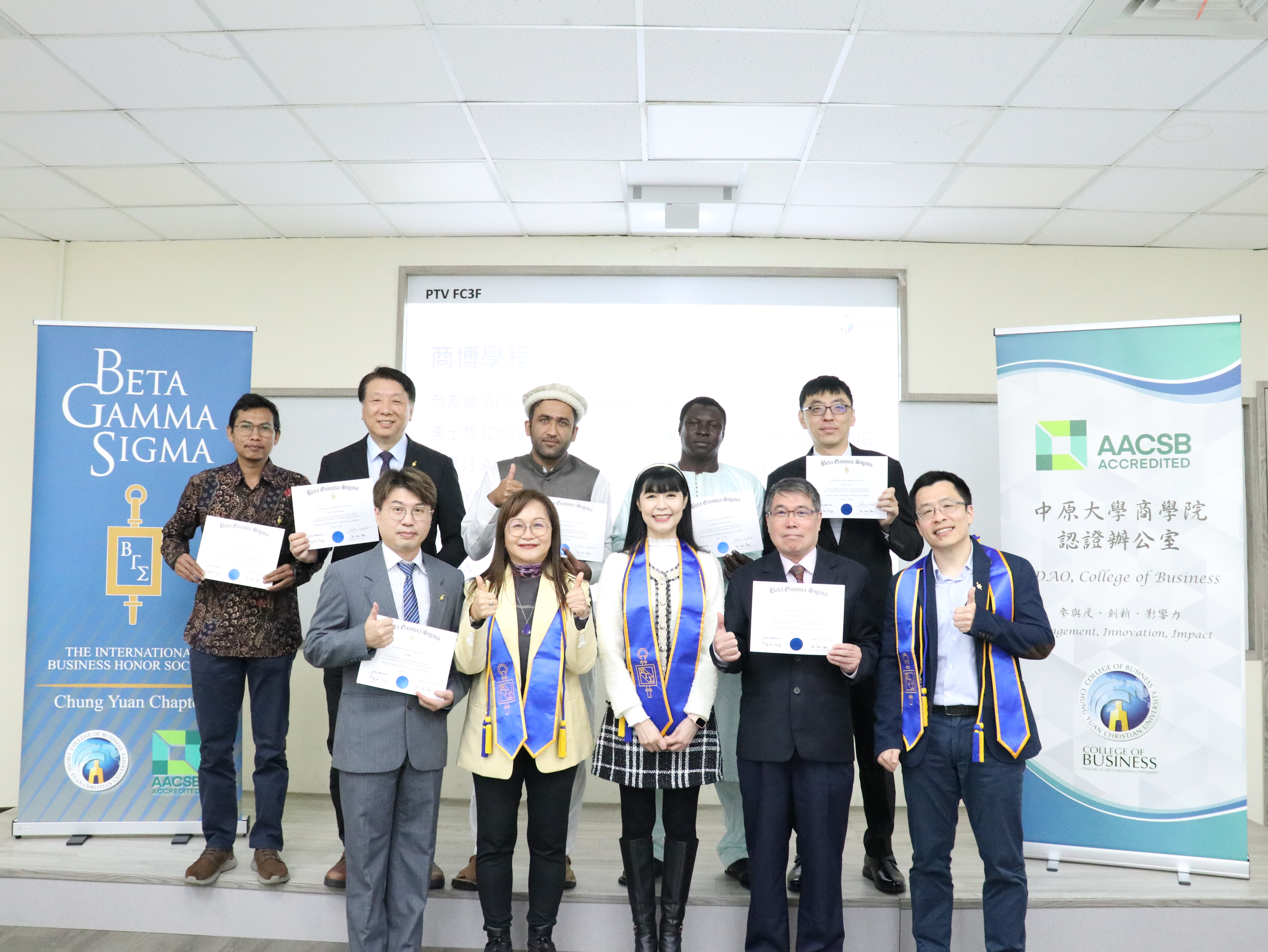 The College of Business at Chung Yuan Christian University held the 10th Induction Ceremony of the Beta Gamma Sigma (BGS) CYCU Chapter on April 1, 2026. The ceremony was presided over by Dean Min-Lei Chang, who led the new inductees in reciting the BGS oath and presented them with membership certificates.